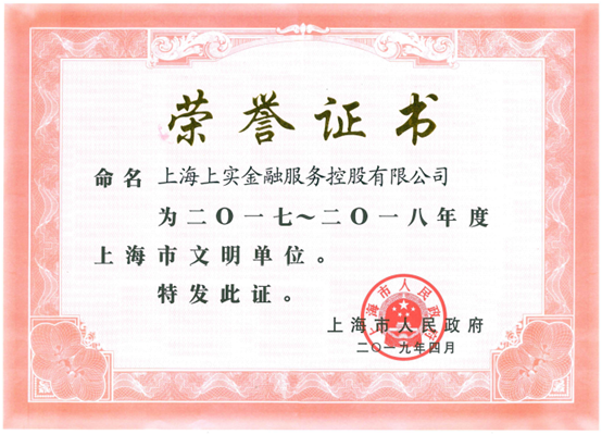 上实金服获“2017-2018年度上海市文明单位”光荣称号